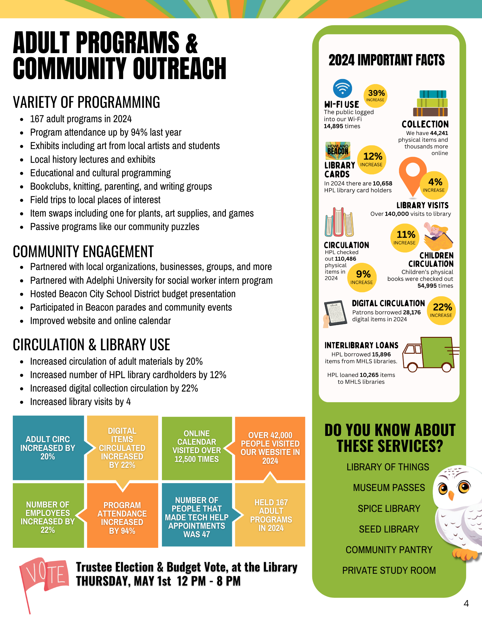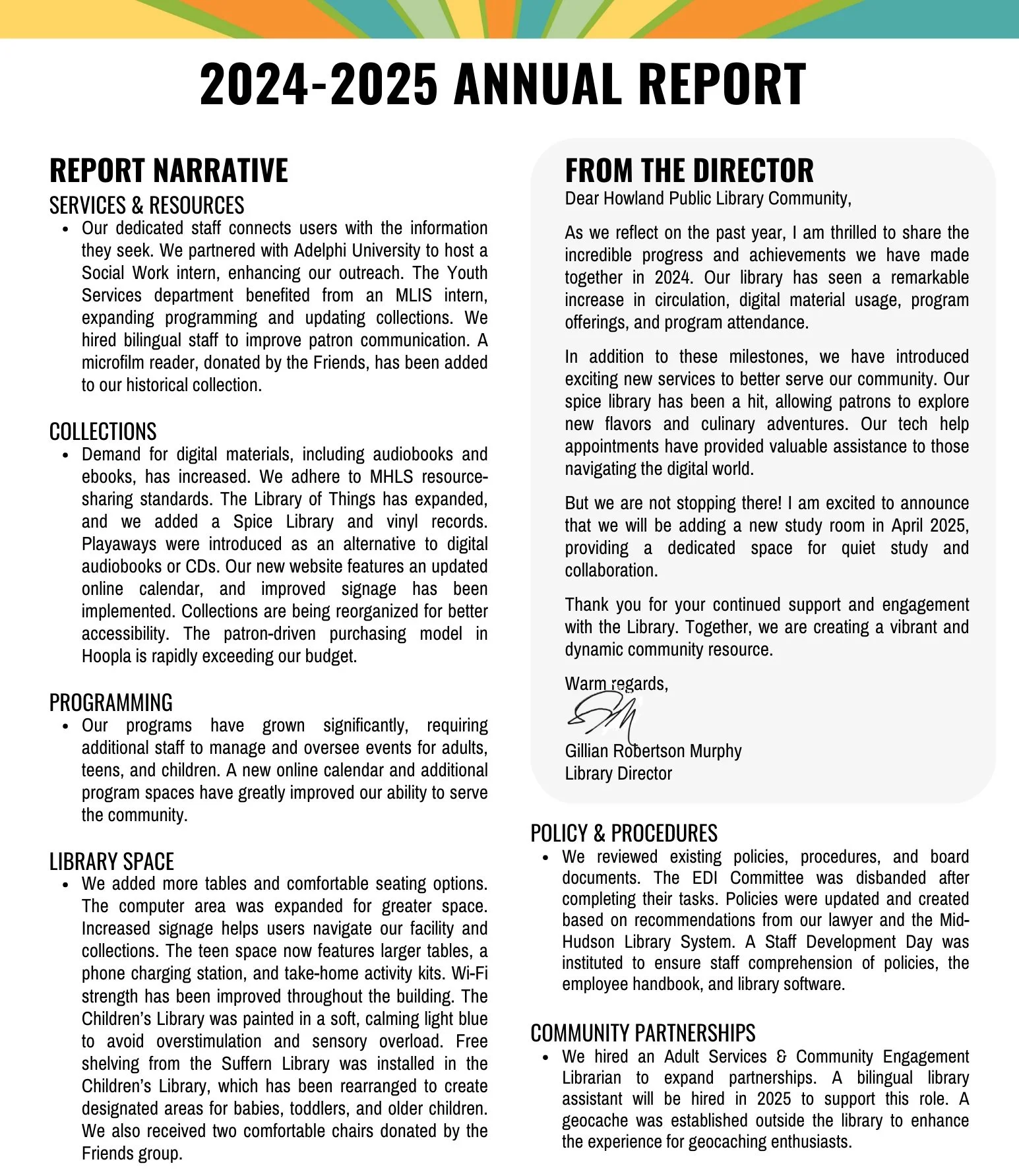 The Howland Public Library will continue to provide quality services to our residents. Our digital collection is growing rapidly, and we offer numerous educational programs and helpful services.