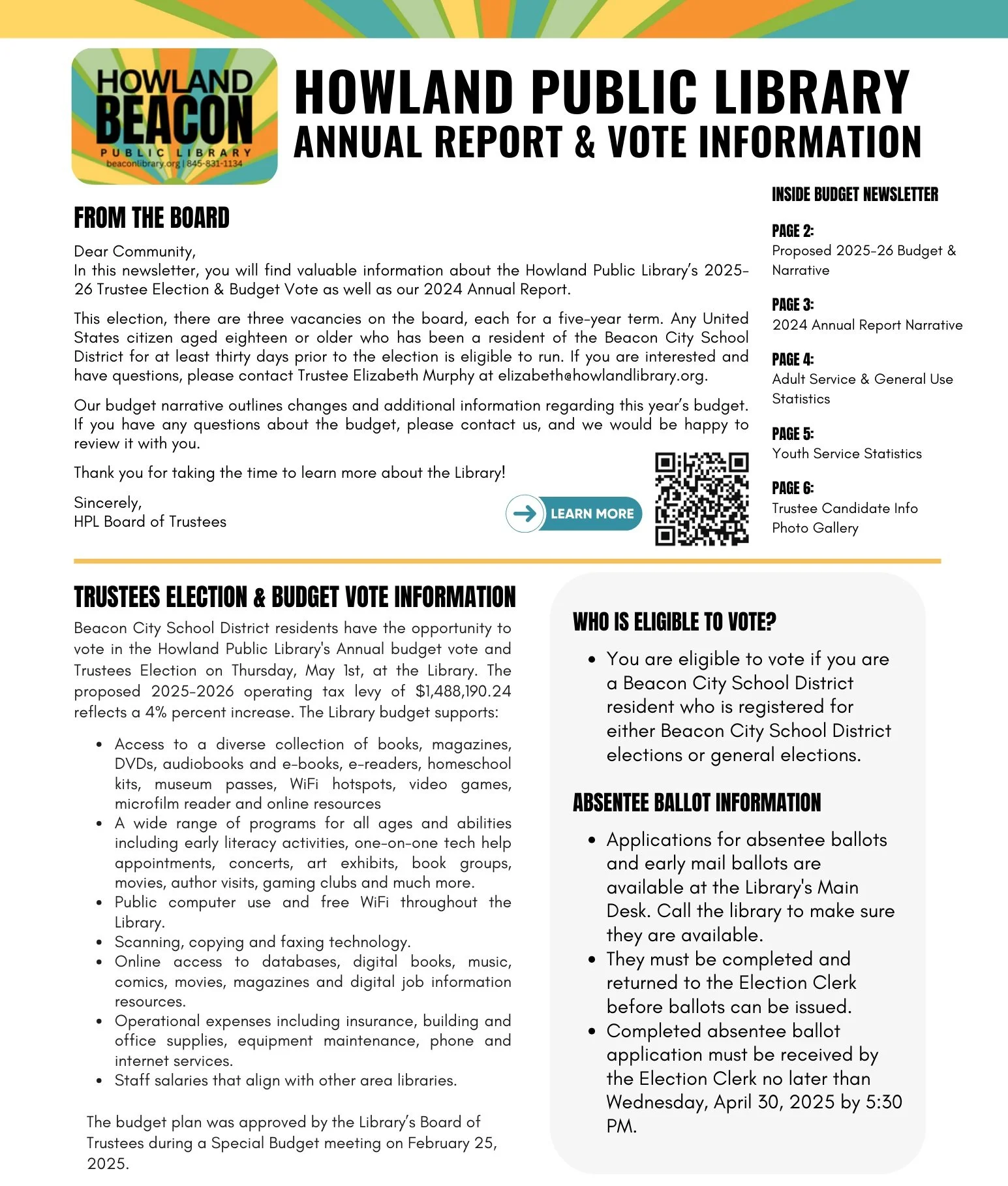 As a nominee, I offer my experience, love, and commitment to the Howland Public Library. It would be a privilege to serve once again. -